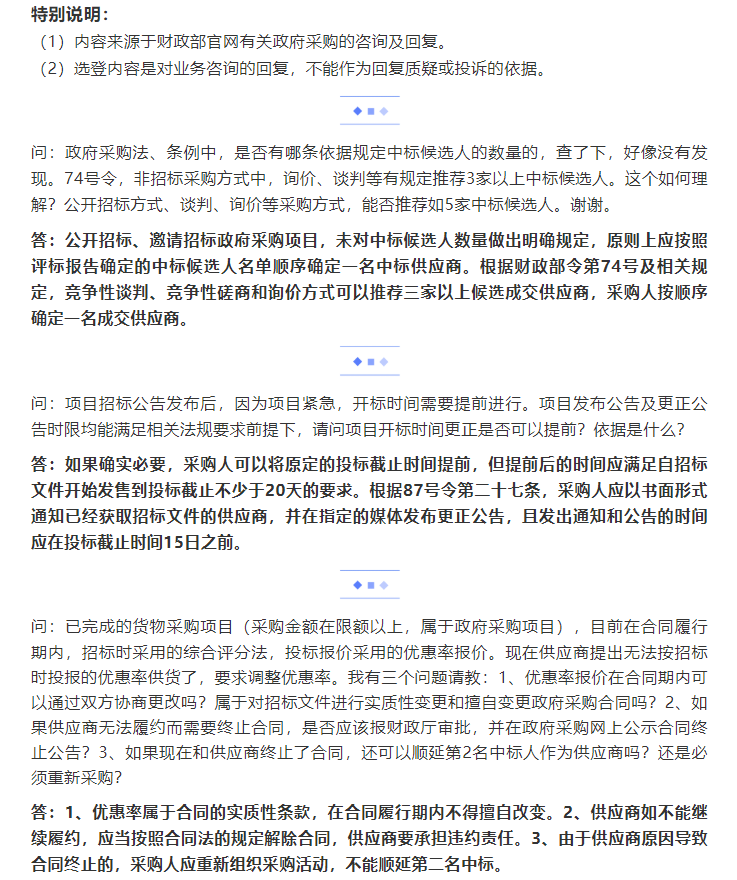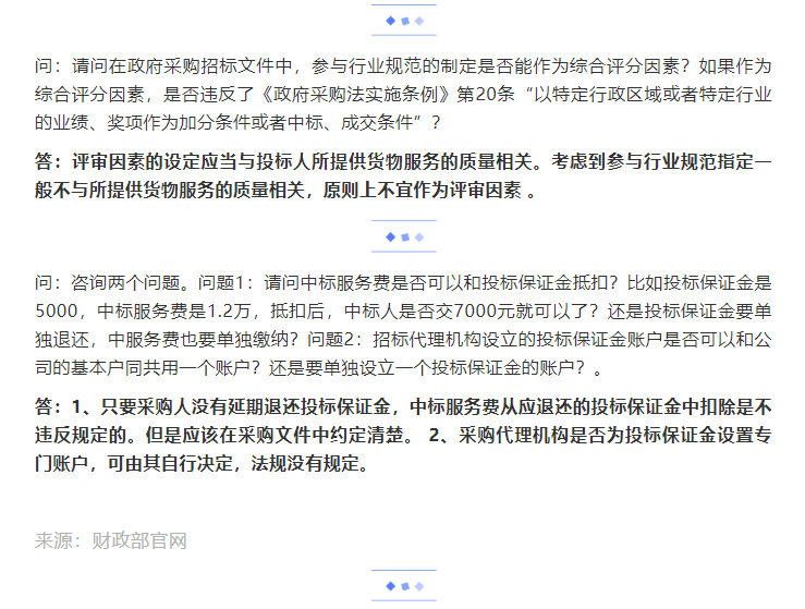 財政部政府采購咨詢留言回復(fù)選登